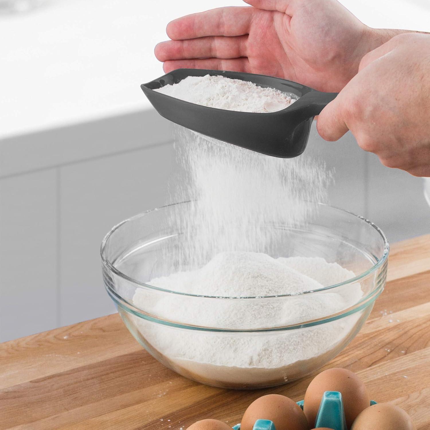 ERGONOMIC DESIGN: Designed for easy scooping, the Scoop & Sift features a shovel-shaped front and thick lip to avoid spills. The comfortable handle makes it easy to go from measuring ingredients to holding the strainer over the mixing bowl.